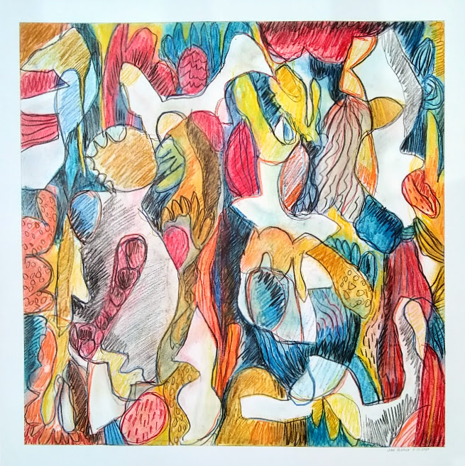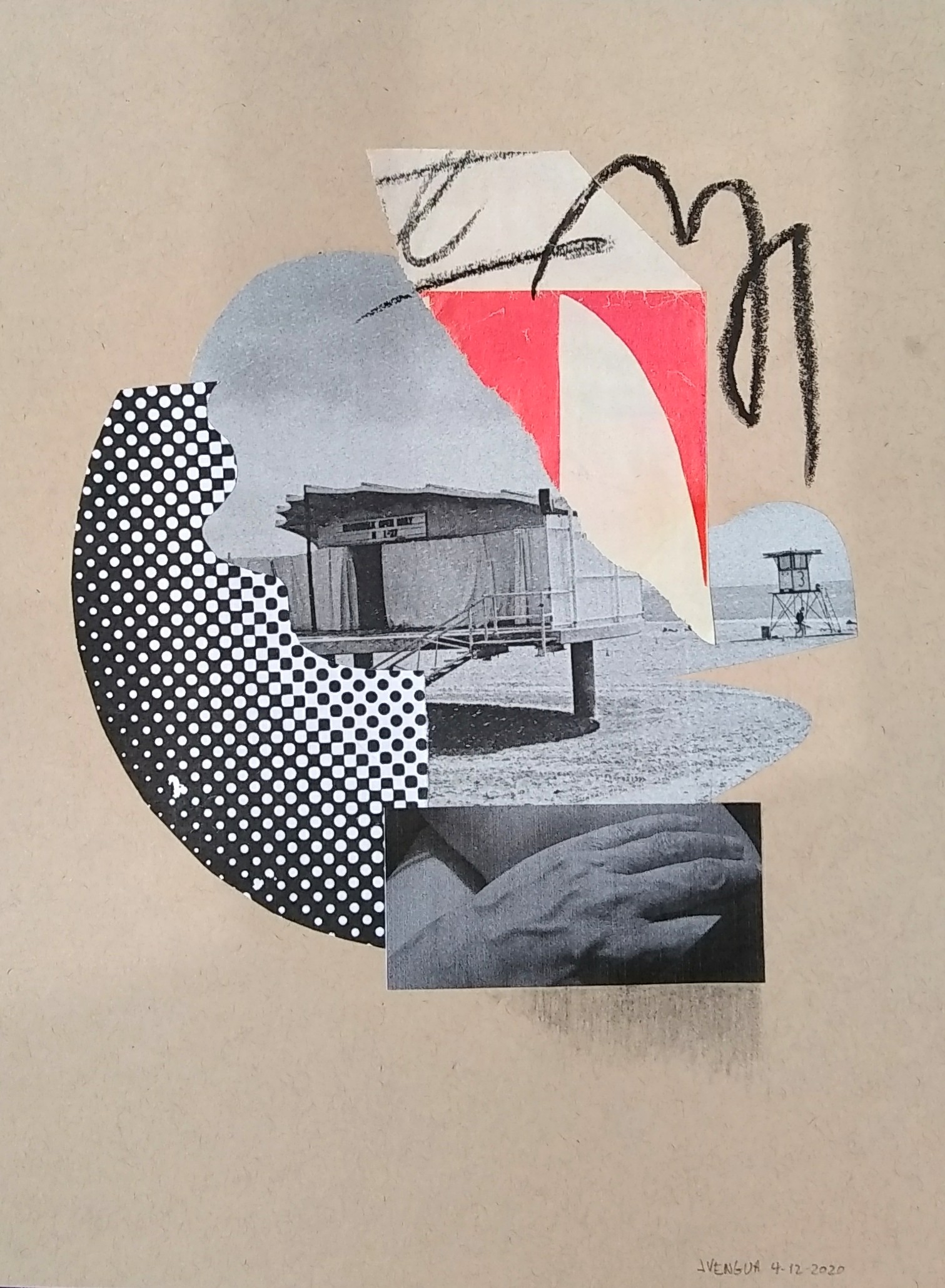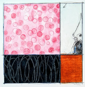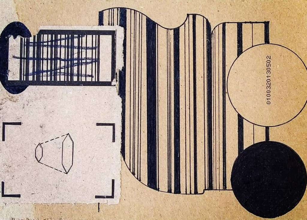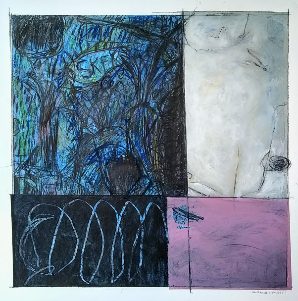 Cold wax medium, oil paint, pencil, ink on paper, and postal art on cardboard.