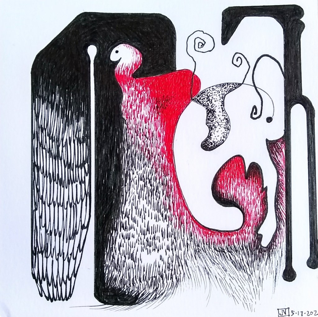 “Retro Blue,” Charcoal, acrylics on canvas.“The Tax Bird.” Ink on bristol. 8×8 in. By Jean Vengua.