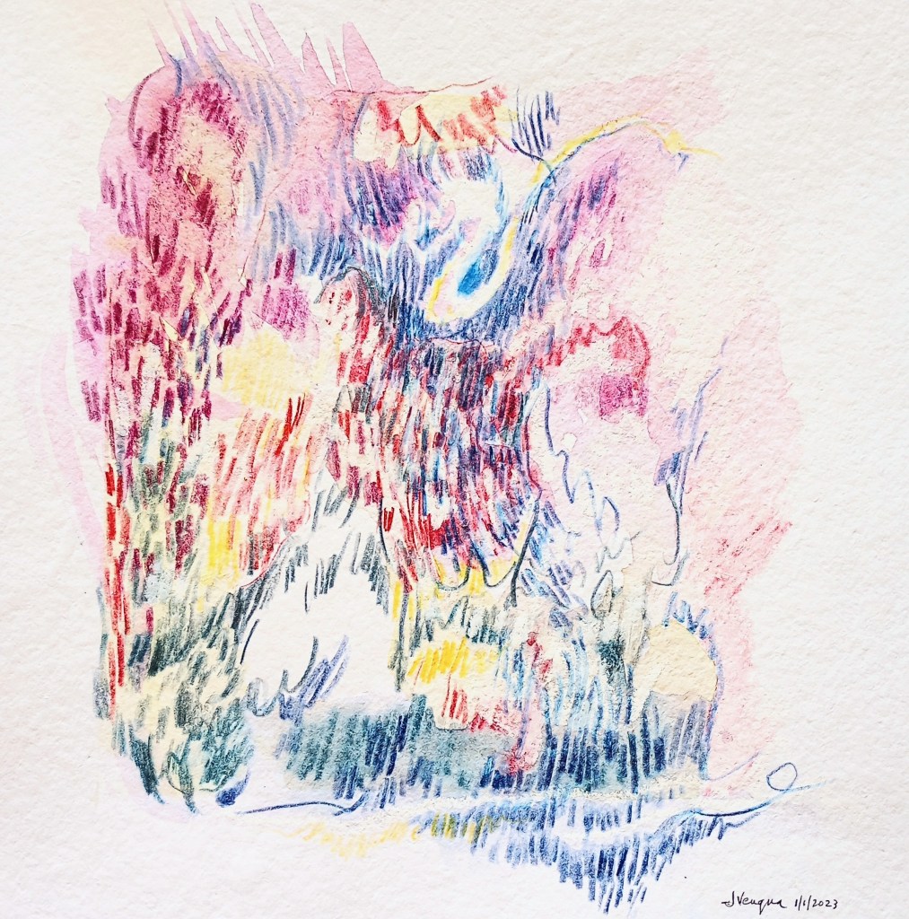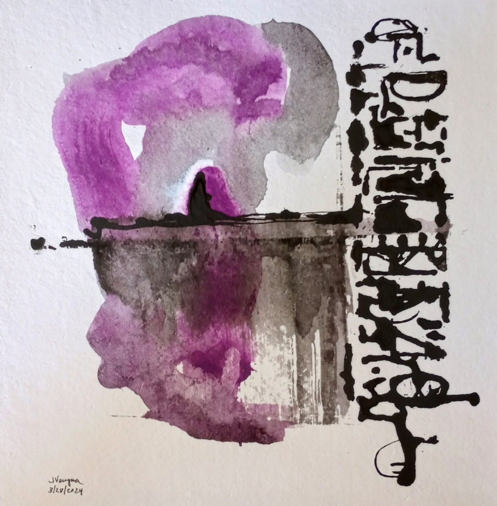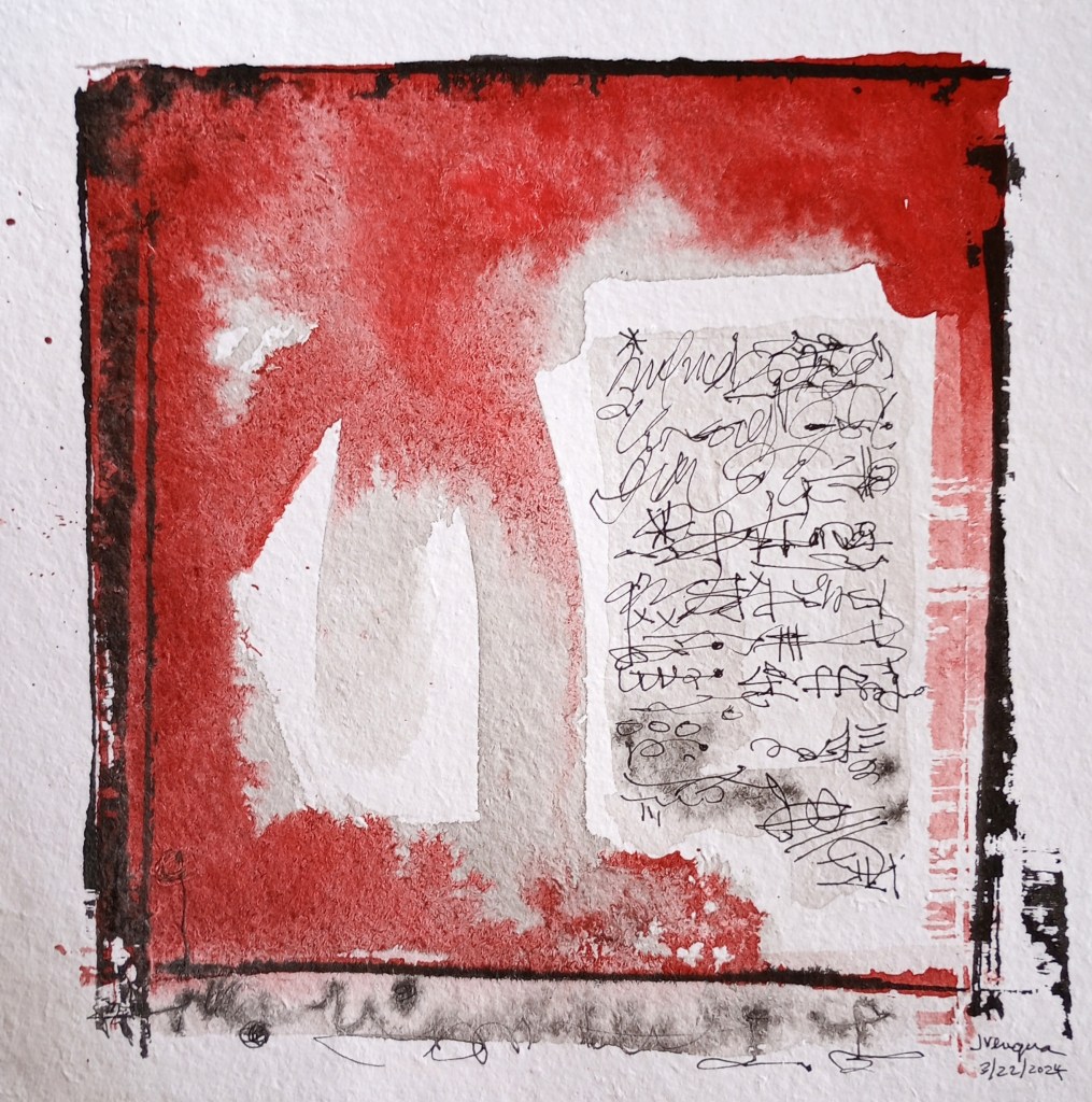 “Red Asemic,” Ink on Shizen paper, 10×10 in. 3/23/2024. Jean Vengua.“Incorporeal,” pencil and pastel on Shizen paper, 10×10 in. 2/1/2024, by Jean Vengua.“Don’t Think Twice,” Collage: ink, watercolor, and ticket on Khadi paper, 6×6 in. 7/2024. By Jean Vengua.“Black and Blue Asemic.” Ink and watercolor on Shizen paper, 10×10 in. 3/23/2024. By Jean Vengua.