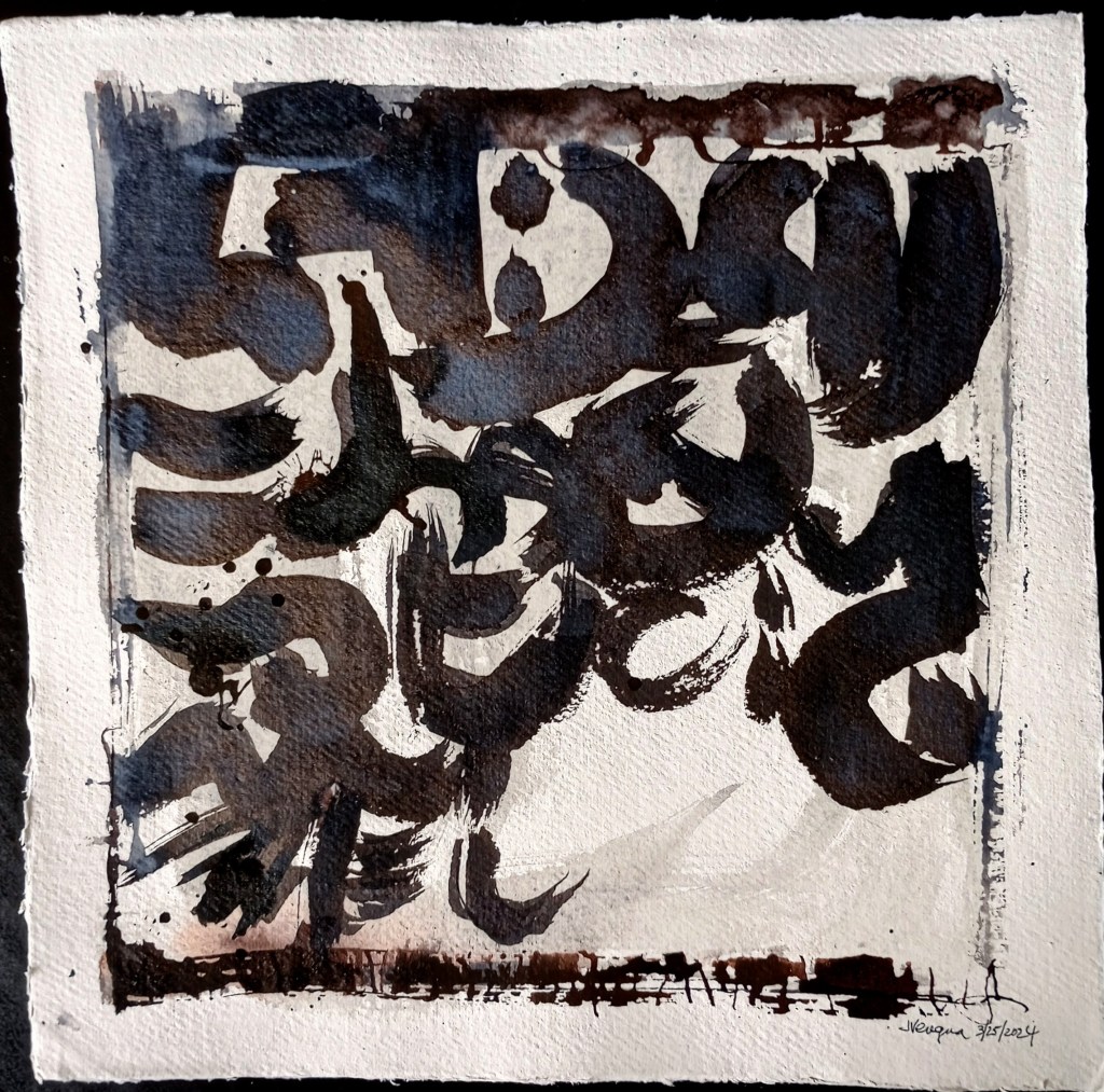 “Indigo Moon Asemic,” Ink on Shizen paper, 10×10 in., 3/27/2024. Jean Vengua.“Stone and Keyboard.” Ink and watercolor on Greenfield paper. Small. 2024, by Jean Vengua. “Liquid Earth Asemic, Ink on Khadi handmade paper. 12×12 in., 3/26/2024, by Jean Vengua.