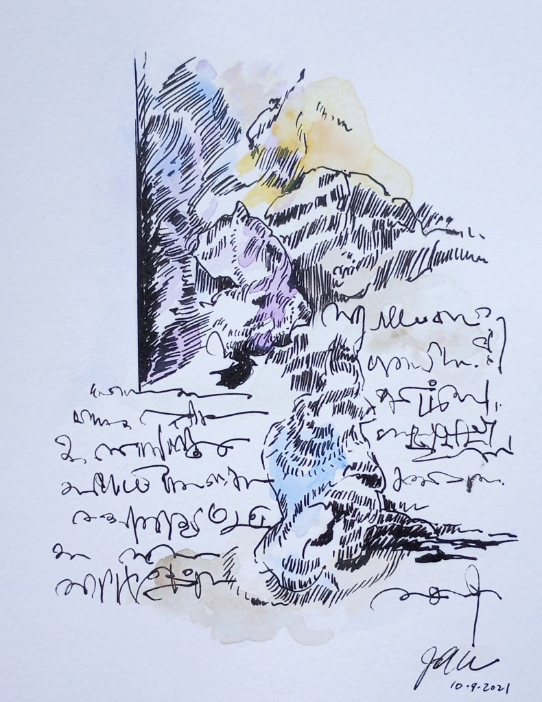 “Nameless Asemic,” ink on paper, started 2021, revised with color 9/2/2024: