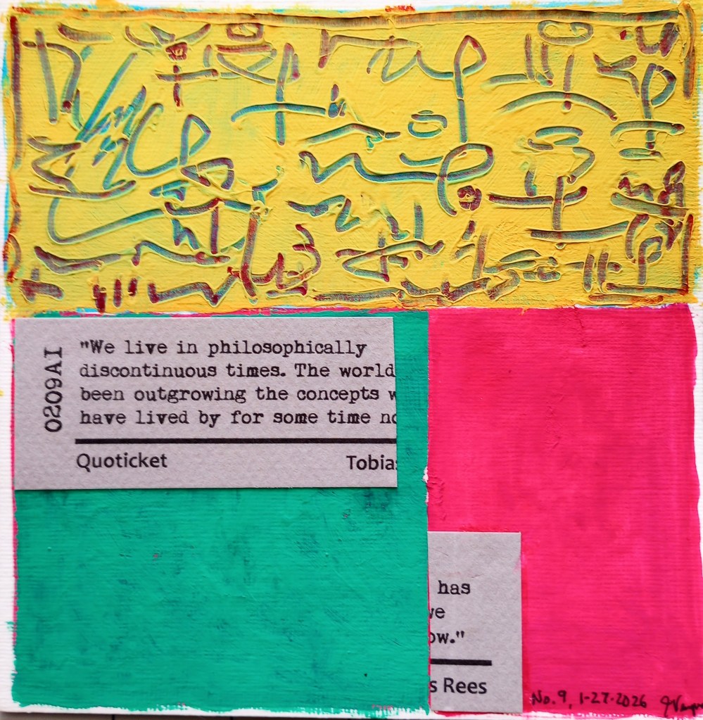 Why did I pick this particular item from the collage packet? I guess I resonated with the “discontinuity.” I’m experiencing what’s happening here in the US and the world (violent rifts, changing loyalties), but at the same time I feel that we are entering a great shift in consciousness, a change from what we’ve known previously; we don’t know for sure what’s coming next. It’s not only philosophical, spiritual, or emotional–it’s material (physiological, biological); maybe even linguitstic, too. We don’t have the language to explain it all (thus, the asemic writing).